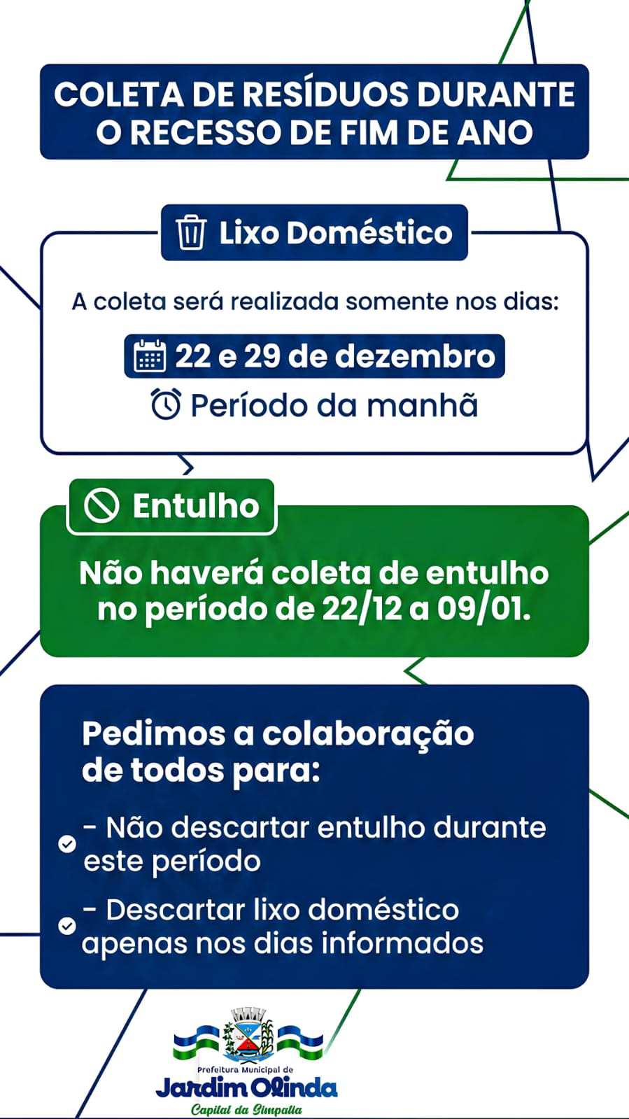 A Prefeitura Municipal informa que, em razão do recesso de fim de ano, alguns setores da administração pública municipal terão alteração no funcionamento durante o período indicado.